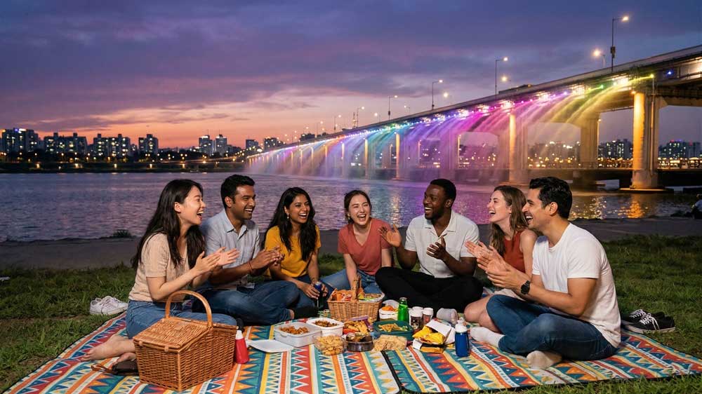 On the final seventh day, wrap up your trip by spending a relaxing time at Han River Park. Renting a mat and sitting at Yeouido or Banpo Han River Park to order ‘Chimaek’ (chicken and beer) is the highlight of a Seoul trip. In 2026, the delivery system has become even more sophisticated, and food arrives at your spot with just one app.