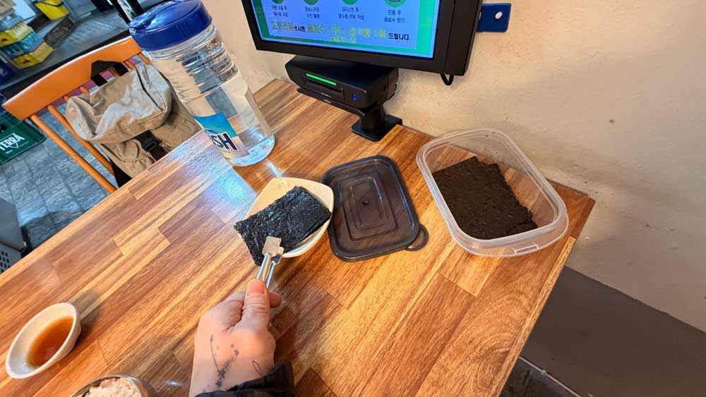 On your next visit, start by checking spicy pork and the stew add-on option on the kiosk, then begin with a simple routine: take just two sheets of gim and lightly dip them in soy sauce.