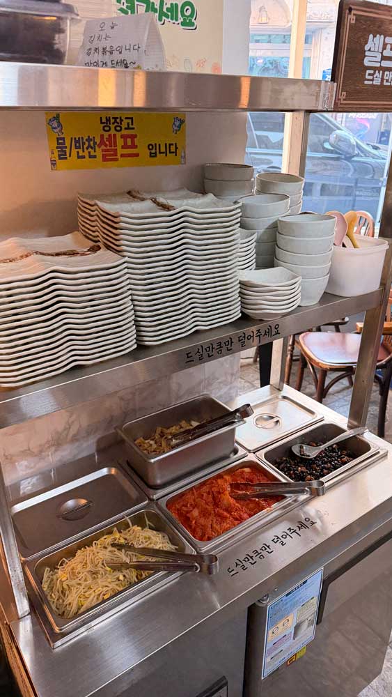 Unlimited side dishes reflect the Korean idea that a meal comes as a “set table.” One practical tip: take small amounts first and go back if you like something, so you can adjust to your taste. And as you mentioned, a must-try here is gim (seaweed). Take a sheet or two, lightly dip it in soy sauce, then eat it with a spoonful of rice—surprisingly big flavor for something so simple.