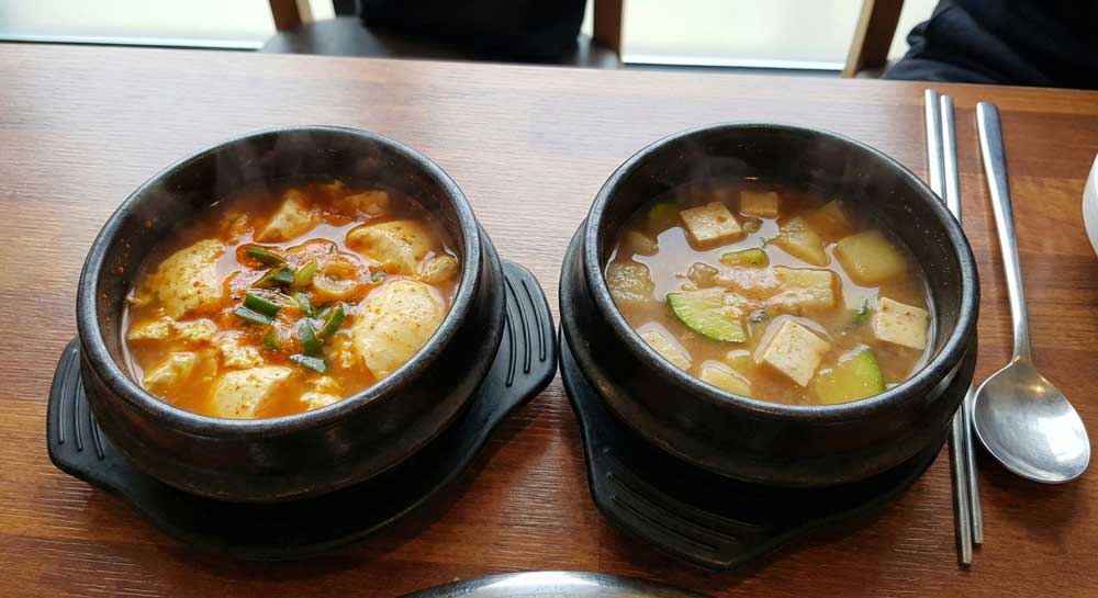 left soft tofu stew with reddish broth, right doenjang stew with brown broth